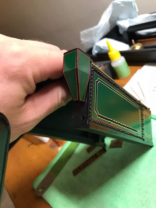 The tender body was drilled and rivetted 3/64 brass; 450 of them.....all glued in with shaft quality loctite. Took a while. Square type lamp bracket manufactured and soldered on and more C2B handrail knobs.