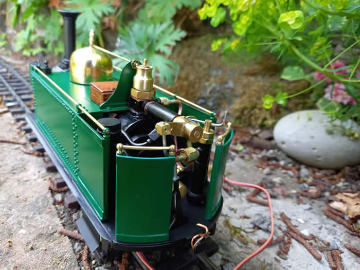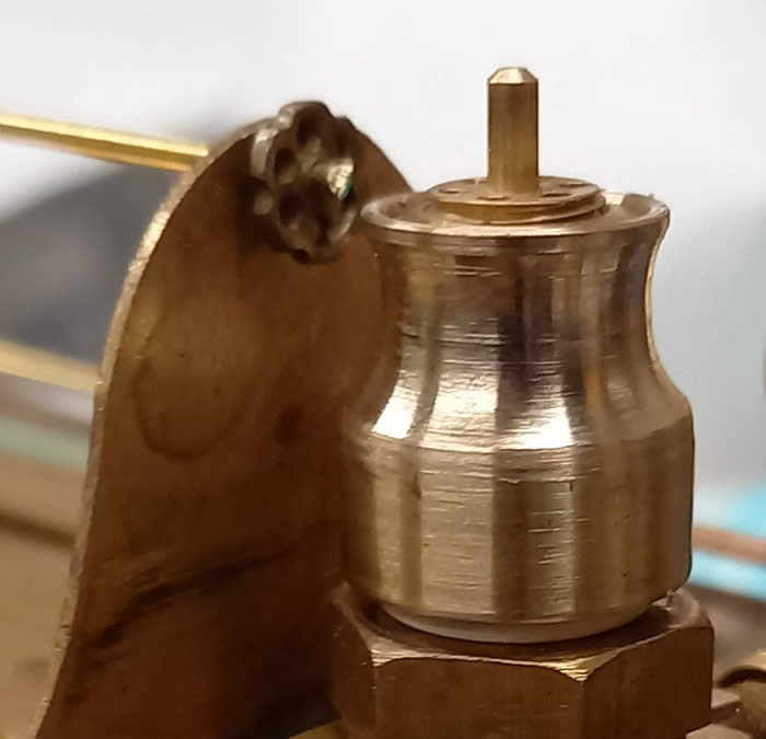along with the tank fillers, handrails [ supported by very small knobs from Chuffed 2 Bits ] and dome made on the lathe by lots of filing. The dome fits on a boiler stub. The boiler filler [ Goodall valve ] can be seen at the rear. A wooden tool box fits over the filler.