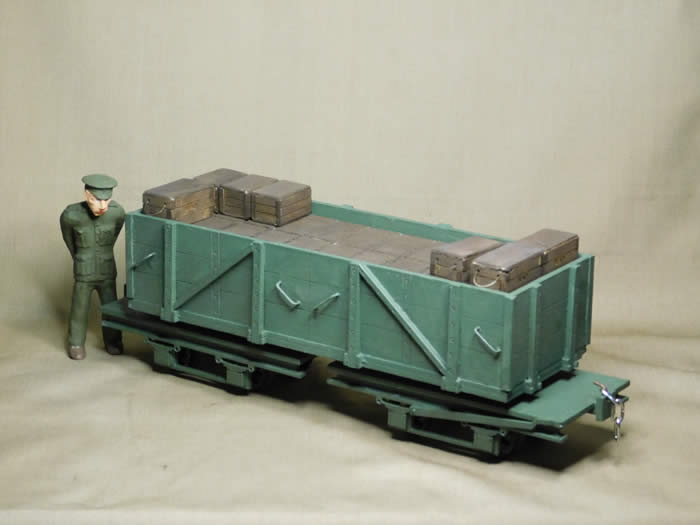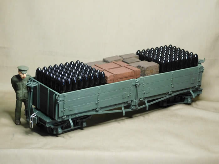 WDLR Class D wagon built for use on heavier track. This Swift 16 resin model carries a heavy load of shells over each bogie with lighter ammunition and rifle boxes in the space between.