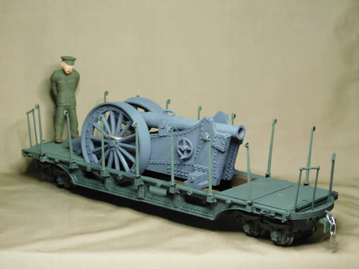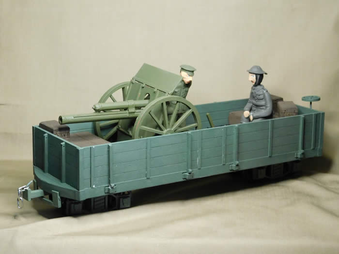 American gondola loaded with a British 18 pounder field gun illustrating the larger dimensions of the wagon. The wooden kit was produced by Red Star.