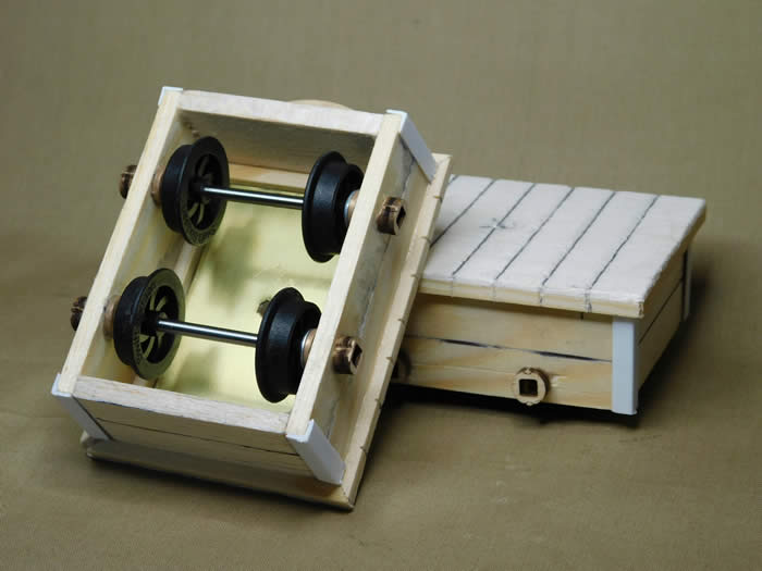 Running trials behind a 20 hp Simplex proved that the combination worked well, so the model was disassembled for painting. I decide to experiment with Humbrol enamel washes that had lain unused in my paint box for some considerable time. Dark brown for the wooden body, rust brown for the metal corner strapping and liberal amounts of oil stain wash around the axle bearings. This simple model was thus completed in the spirit of improvisation of the prototype using offcuts of wood, plastic and brass, plus wagon parts that I had liberated from my spares box.