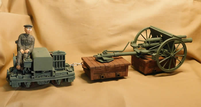 One example was by the Australian troops of 1 ANZAC Corp who used make-shift wagons on narrow gauge track to move their 18 pounder field guns. Inspiration for a 16mm model of one such gun carriage came from a photograph dating from 1917 taken in Picardie on the Western Front. This shows the track covered with liberal amounts of mud that the Somme was known for and the entire platoon man-handling the gun; apart for the NCO, of course, who naturally stands aloft on one