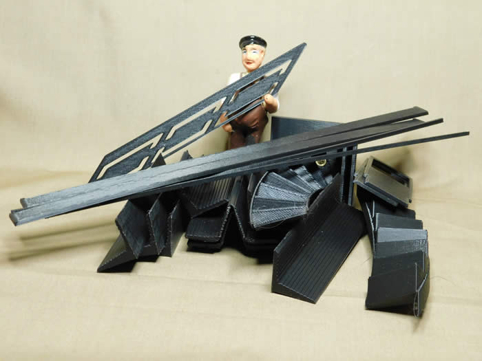 The dimensions of the horse trailer were scaled from the steam tram to maintain the correct proportions. Ever reliant of the remarkable 3d design skills of fellow 16mm modeller, Roy Plum, I was soon in possession of the plastic outpourings of his printer. As always with 3d printing, there was the excess plastic to trim away, edges to clean up and lines to fill before assembly could begin.
