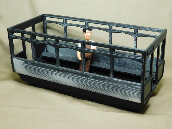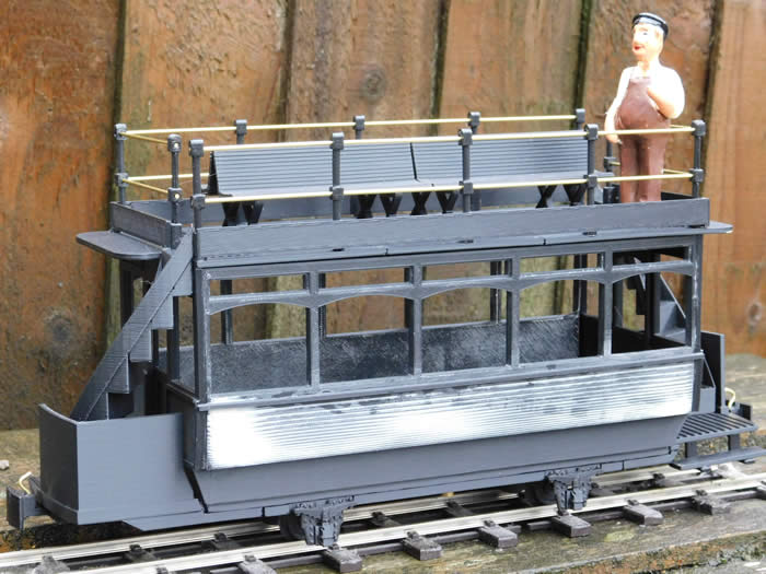 The upper deck detail came next after I had sourced enough brass rod for the handrails and decided whether the handrail corners were to be curved or butted straight into a corner post, I opted for the latter. Bench seating was assembled but left unattached to facilitate painting.