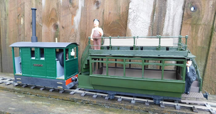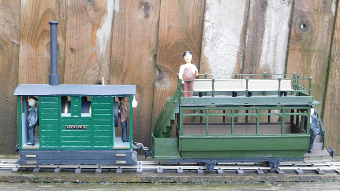 Most preserved trams that I have seen have a red & white, or a brown & white, livery. However, I chose a single shade of green to match the tram engine. Running trials indicated that additional weight was needed for stability. The final touch was to build an extended chimney for the steam tram to minimise the discomfort of the gentlemen on the upper deck! So there we have it; steam tram with a horse trailer.
