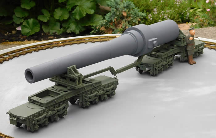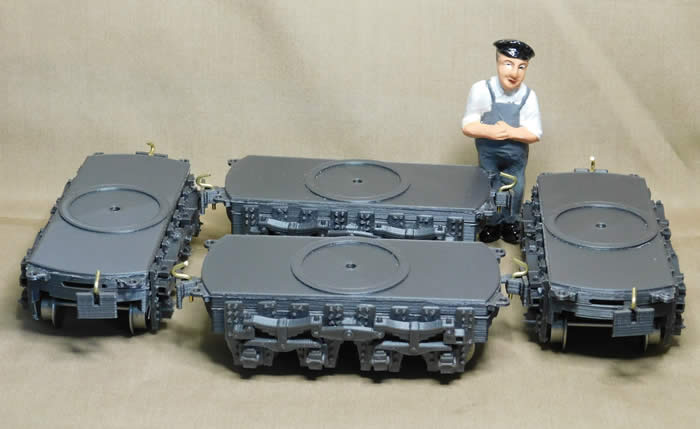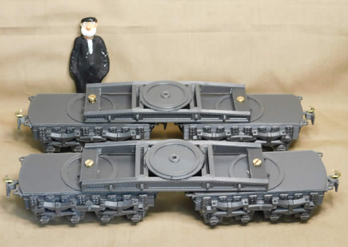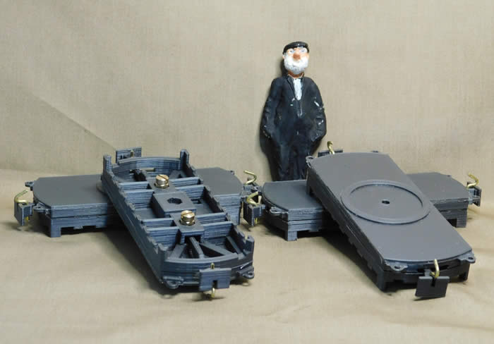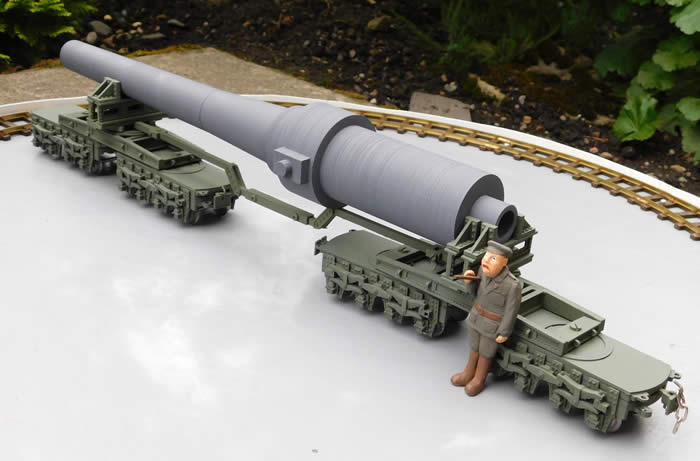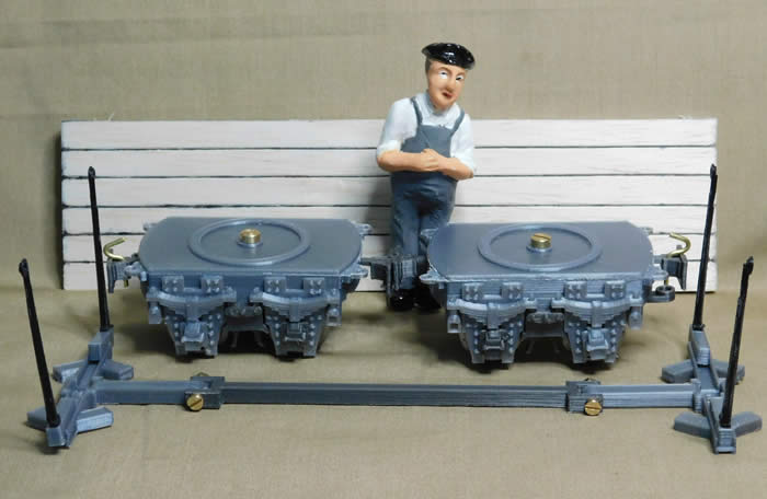 The larger gun carriage has two pairs of 4-axle Péchot bogies linked together by a bridge frame. These bridge frames, in turn, are joined by a central beam that also carries the gun supports above each bridge. A total of 16 axles mean that the gun carriage can accommodate the 48 tonne 340 mm canon and still be within the système Péchot maximum axle load of 3.5 tonne. Despite the model being 615 mm over buffers, and carrying a 450 mm long load, the gun carriage negotiated Faller 14 inch radius curves on my portable test track.
