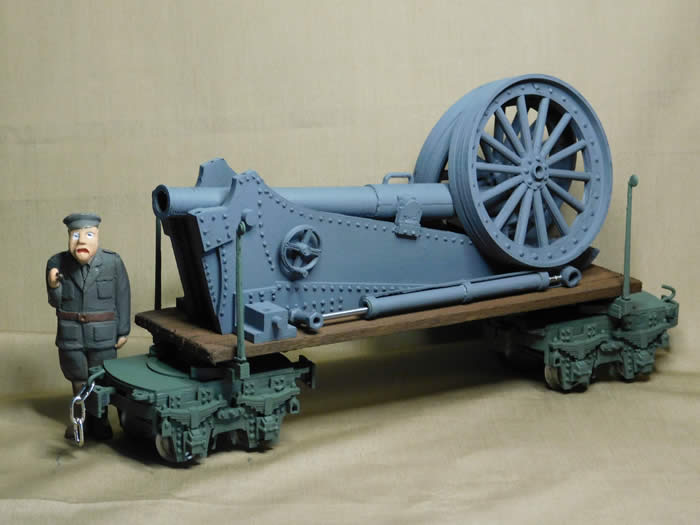 A pair of two-axle bogies was used to make a well wagon that was the workhorse of the French military narrow gauge railways but what I wanted to model first were the combinations of bogies used to move the artillery pieces. A pair of two-axle bogies was arranged with a wooden platform to support a field gun such as the 155 mm de Bange, type Saint Chamond. Now this artillery piece itself is interesting on a number of counts. In 1872, Colonel d’Artillerie Charles Ragon de Bange invented the breech loading system for canons and went on to design a whole range of light and heavy artillery for the French army.