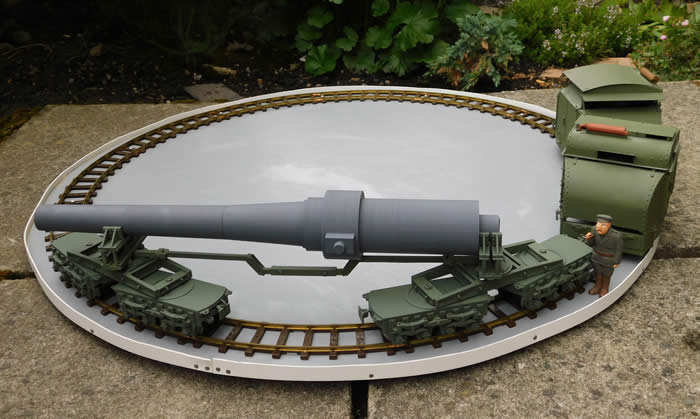 As the war on the Western Front progressed, naval guns were deployed in on multi-axle standard gauge railway gun carriages and the French artillery experimented with moving some of these heavy canons into fixed positions using the Péchot system on narrow gauge track. An arragement of four 4-axle bogies was used to support the 48 tonne 340 mm calibre canon which could be turned surprisingly easily using the purpose built turntables. Additionally, the Péchot system had a range of cranes to load and unload the artillery pieces and ammunition.