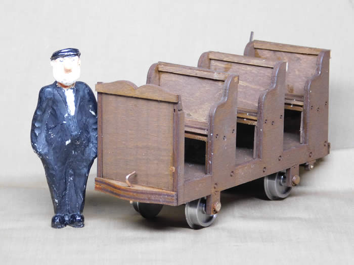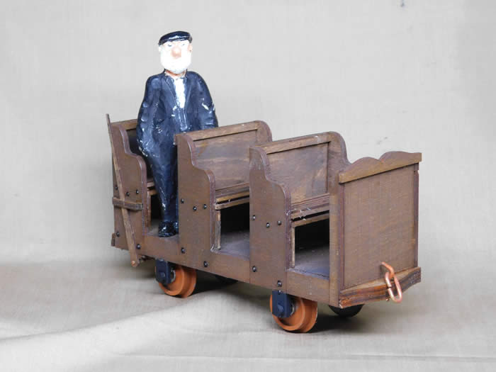 Only one example of the overlooker's carriage is known. This coach was used within the quarry for tours of inspection by the managers and probably dates from 1840. The carriage was originally horse-drawn as evidenced by the shape of the front with a notch for the reins. It was latterly moved by the Hunslet locomotives and, with all the seats facing forward, it could be hauled up and down the inclines.The overlooker's coach was just over eight feet long and only three feet two inches wide, with a wheelbase of two foot ten inches.