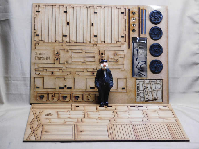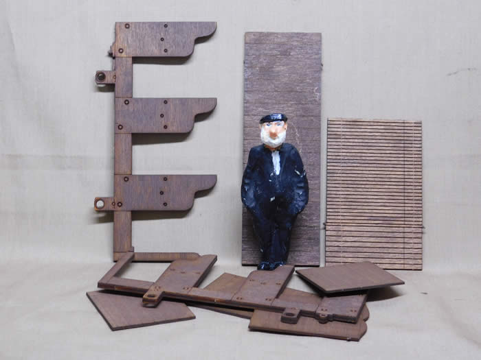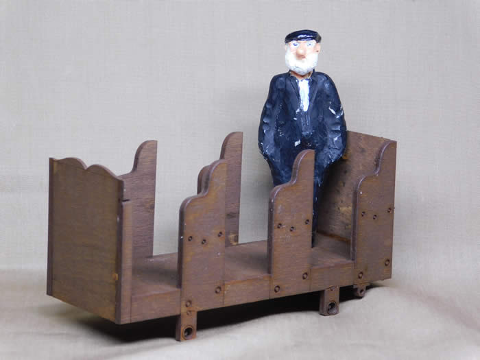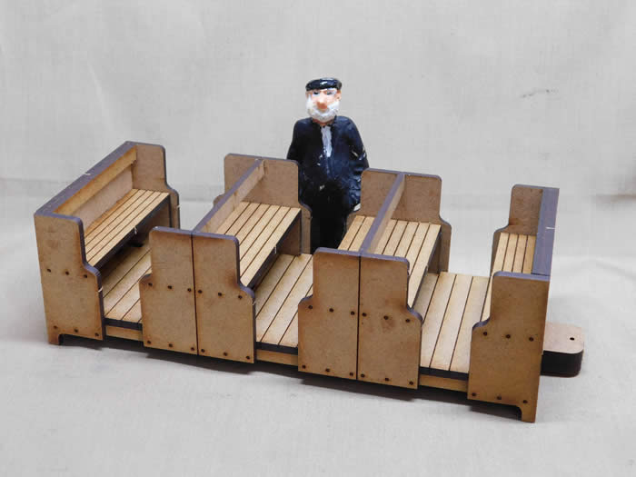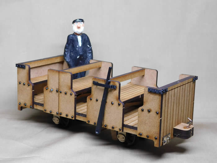 The laser-cut wooden components from the IP Engineering kit were stained dark brown before assembly. Construction was straight-forward using super glue, with the slatted seats and brake lever as the final touches.