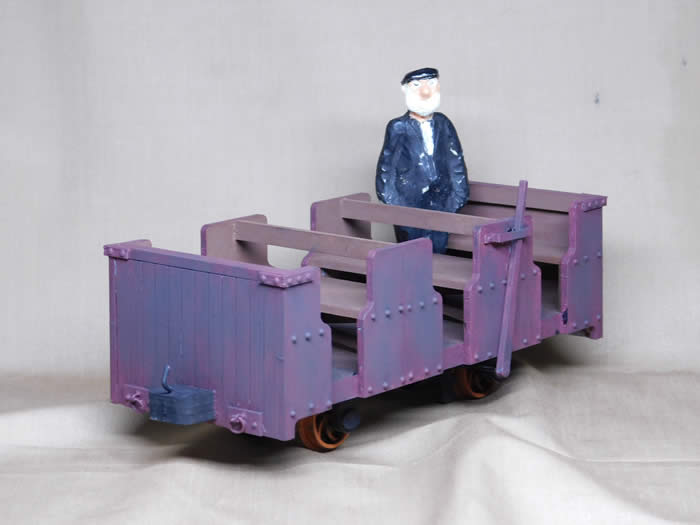 After sealing with grey undercoat, the bench seats and floor were painted with Humbrol red brown acrylic. The axle boxes and sole bars were painted matt black and the wheels treated with RailMatch light rust. Slate grey weathering powder was used on the interior floor.