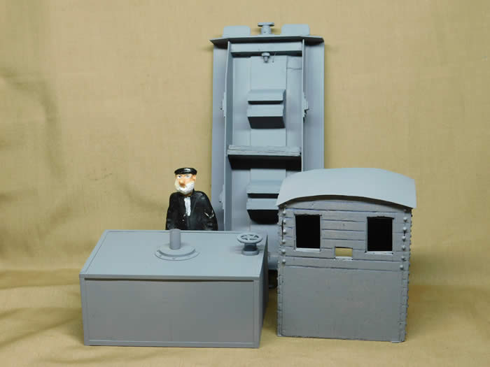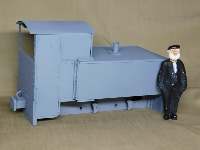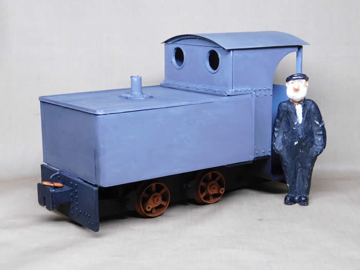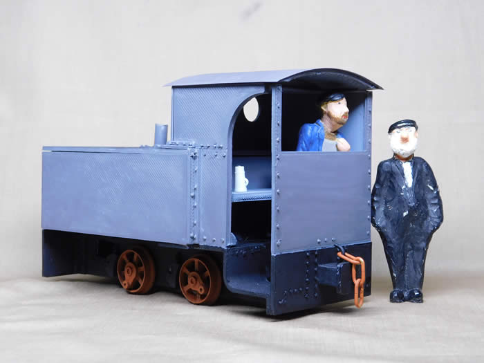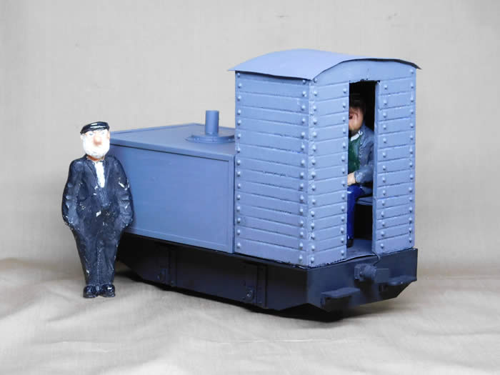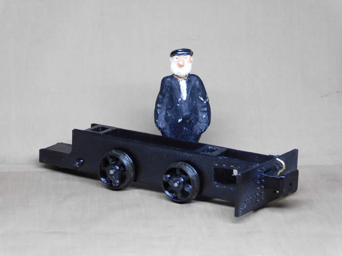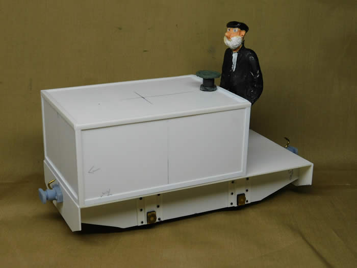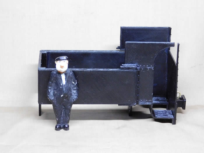 The main components of the brake van were designed to clip together to allow easy disassembly for painting and maintenance. After applying a grey undercoat using a Hycote spray can, the frames were painted matt black with the water tank and cab finished in Penrhyn grey. Wheels and chain couplings were treated with RailMatch light rust paint. To complete the model, a brakeman was fixed within the cab along with