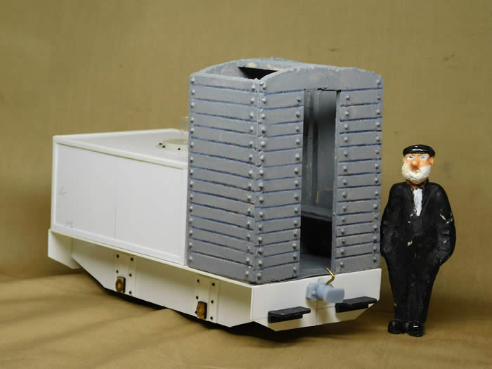 The cab was fabricated from balsa wood with the window surrounds tidied up with plasticard angle. Planks were scored into the wood with a pencil and NailArt 2mm half-moons added to represent the coach bolts. Seats on either side of the door were built so that the brakeman was at the correct height to see through the window. Halfords grey primer was then used to seal and harden the wooden cab before adding a plasticard roof.