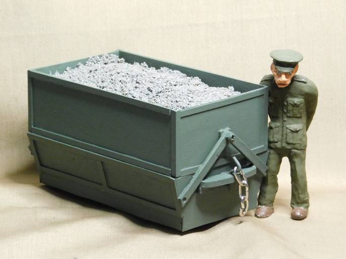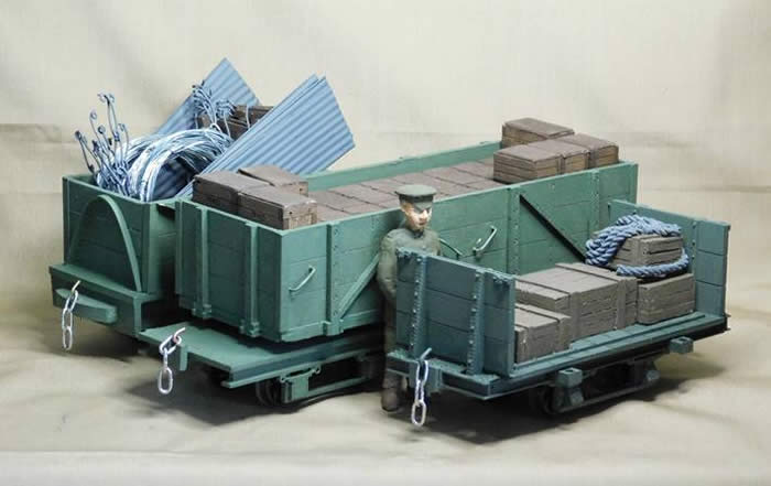 An initial order of 1,000 miles of 60 cm gauge track was placed, along with orders for large numbers of steam and petrol locomotives. The WDLR also sourced 1,000 four-wheel wagons with steel frames and 3-plank wooden bodies. In the light of experience in the field, the specification was amended to in include, among other improvements, removable sides and ends. These wagons were lightweight so that they could be taken forward by locomotives as far as was safe and then hand-worked into position by the troops on temporary trench tramways. It was soon realised that wagons with greater capacity were required for efficient locomotive working and, consequently, a larger version of the four-wheel wagon was introduced. In true military fashion the WDLR wagon types acquired letter designations, these first two being, not surprisingly, Class A wagons and Class B wagons. Demands for supplies, particularly shells for the artillery, continued to increase and a Class C wagon was specified and ordered. Class C were wooden-bodied bogie wagons with twice the load capacity of a single Class A wagon. In the light of ever increasing demand for supplies, the decision was made to use heaver rail on the WDLR to allow greater axle loading and a larger Class D bogie wagon was designed that became the mainstay of future British narrow gauge traffic on the Western Front. Class D wagons were steel-framed, wooden-bodied open wagons that permitted a wide range of loads, or troops, to be carried. The War Department drew up a detailed specification for each class of wagon, which allowed different companies to contribute to the war effort. Although all Class D wagons were of the same dimensions, they came with a three or four plank body dependant on the manufacturer.Class E wagons were the same as Class D wagons but with a dropped centre between the bogies. This was designed to allow the transport of bulkier, but lighter, supplies such as animal fodder. Class F wagons were a derivative of Class E wagons with no bodywork above the solebars. In place of the upper bodywork were eighteen removable stanchions that permitted large, heavy items, such as field guns, to be carried. All these classes of WDLR wagon were built with versatility in mind but a number of operational requirements led to the development of specialised rolling stock.Paraffin, cylinder oil and lubricating oil were required for servicing the large number of petrol locomotives. Consequently, Class G wagons had three rectangular tanks mounted on a four-wheel Class A frame. These wagons were not produced in large numbers, unlike the next class of wagon. Clean water, for the troops and the steam locomotives, was in constant demand and so the Class H wagon was a 1,500 gallon capacity steel tank mounted Class D frame and standard WDLR bogies. The following letters, I and J, were not used in the wagon classification system.Class K wagons were side-tipping skips bought from the catalogue of Hudson (18 cu ft capacity) or McLachlan (27 cu ft capacity). Very large numbers of these wagons were used for all types of construction work, including permanent way work. Assembled into rakes using chain couplings, Class K wagons did not posses the standard WDLR coupling. Class L wagons were ordered from the USA when domestic production of skip wagons could not meet the demand. These wagons were wooden-bodied side-tipping wagons, similar to the MSC contractor wagons in the UK.Class M wagons were something of an anomaly, as the M was for monorail, with the wagon intended for man-hauled use on one rail of a trench tramway. A very small number of side-discharge ballast hopper wagons, classified as Class N wagons, were obtained from Hudsons. These appear to be the standard permanent way wagon already produced by that firm. Letter O was not used for wagon classification, probably because it was one of the three letters in this part of the alphabet that could be easily mis-read as numbers.The final wagon in the WDLR classification, Class P, brings us full circle in the development of rolling stock in a surprisingly short period of time. Class A wagons had been built light enough to be moved forward by troops on the trench tramways but, as we have seen, they were soon superseded by larger and heavier wagons that were needed for efficient locomotive haulage. By 1917, a number of ration wagons were being built specifically for troop-haulage on trench tramways as the other classes of wagon were too heavy for the track of the trench tramways, and the available manpower.Although the ration wagons were of a variety of designs, from a number of manufacturers, they became classified as Class P wagons. Rather than the detailed War Department specification of the other WDLR classes, Class P wagons were only required to be light enough for man, or animal traction, but strong enough for haulage behind a 40 hp petrol locomotive. This was to obviate the need for transhipment from the larger wagons and is pretty much where we started with the small Class A four-wheel wagon. Having scratch-built and kit-built examples of ten of the WDLR wagons classes, there remained only the N and P to complete the set. The Class N wagon was made on a simple wooden frame with plastic bearings, for the IP Engineering 16 mm diameter wheelsets, mounted in the solebars. Plasticard was used to fabricate the body with a load of poor quality ballast that was typical of the Western Front. Roy Plum had designed a 3d printed a 7/8ths scale Class P wagon, and I was grateful that he produced a 16mm version for me. This completes the WDLR wagon classes but there are numerous other wagons to build next that were not given a class designation.