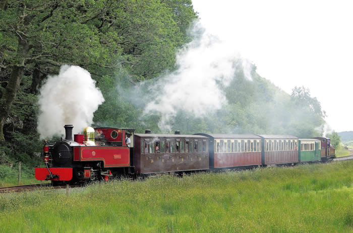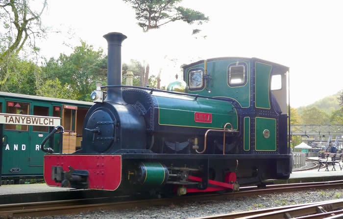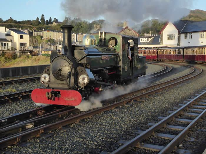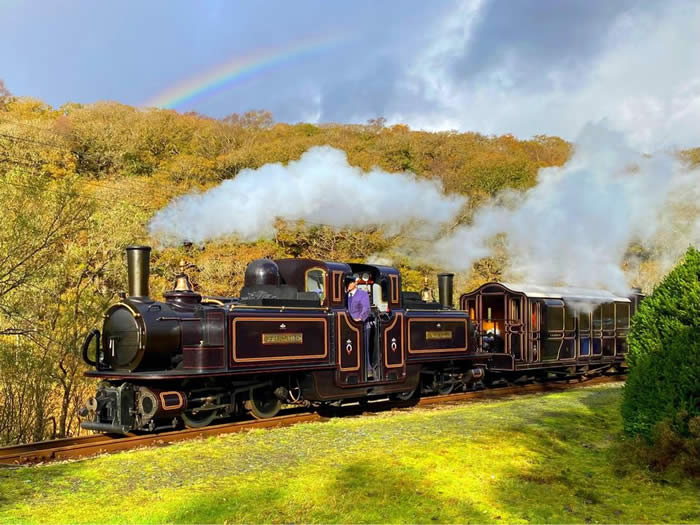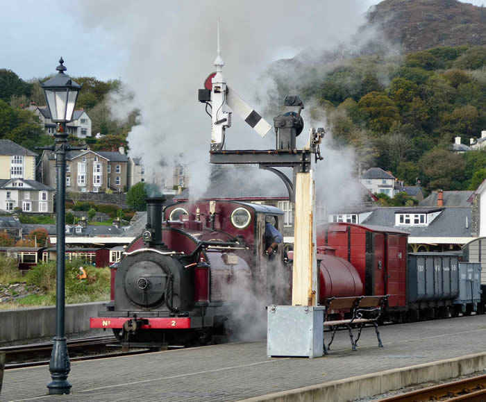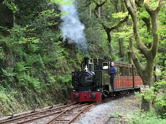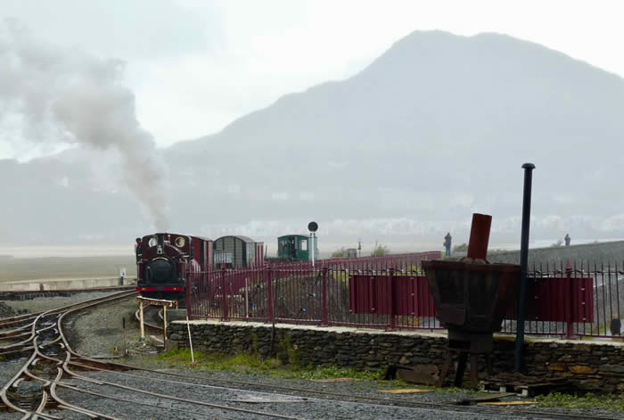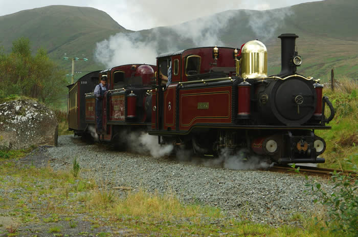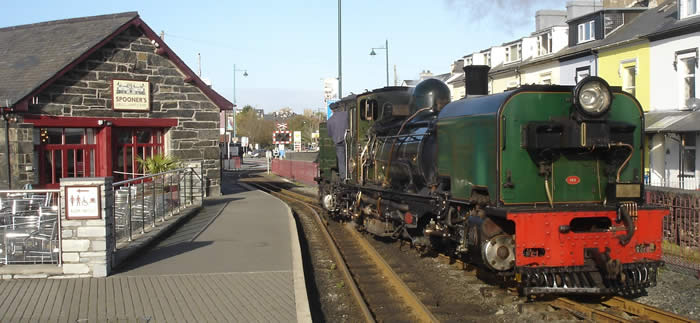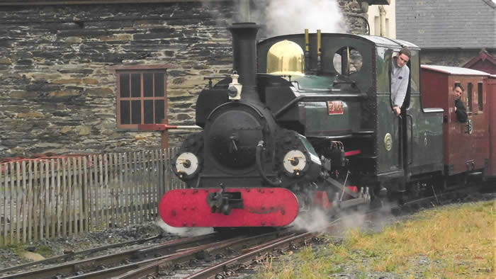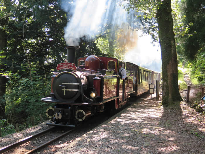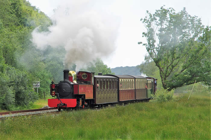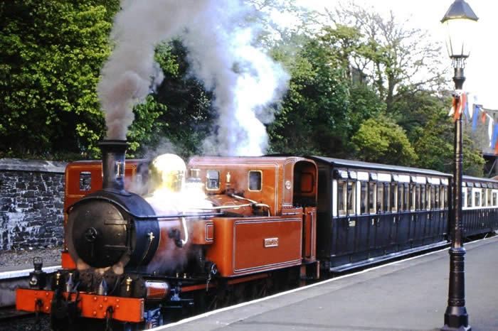 " James Spooner " entering Dduallt station with Victorian carriages :