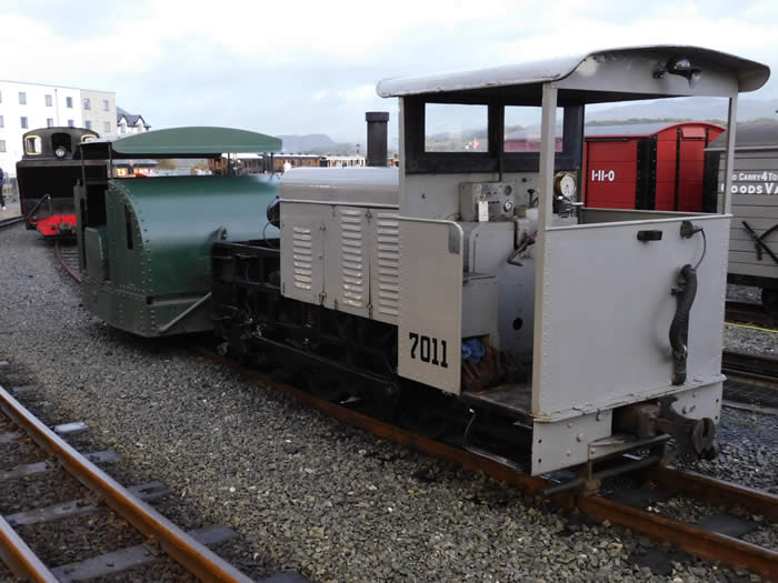 Mary Ann, an Open Simplex, and Moelwyn, a Baldwin Gas Mechanical, pause at Harbour Station : Alco " Mountaineer" in the background :
