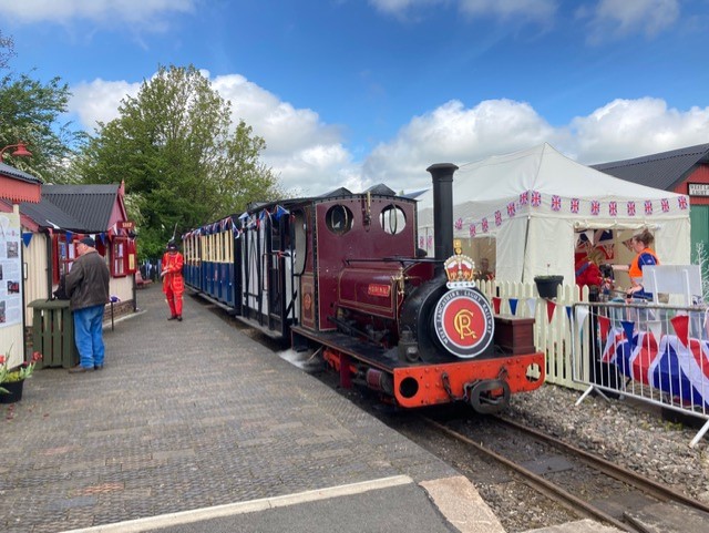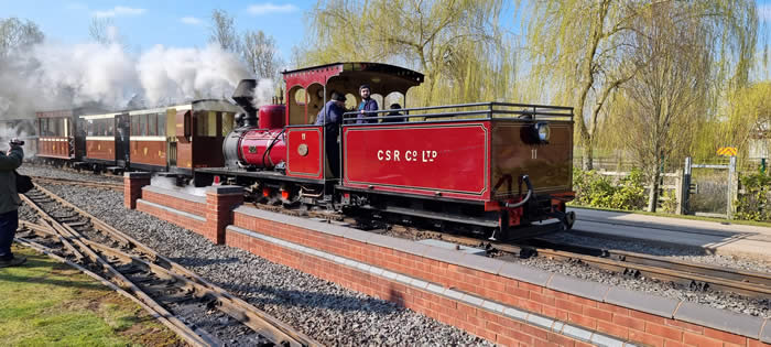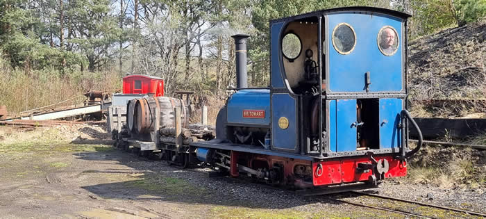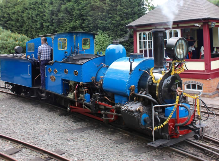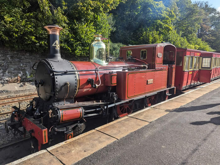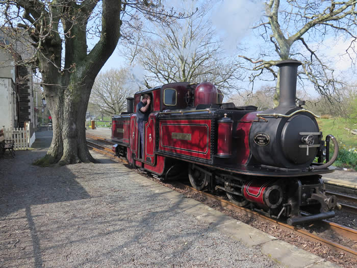 Kerr, Stuart Tattoo 'Stanhope' in Penhryn livery at the Apedale Valley Light Railway returns to Silverdale Station with the last train of the day: