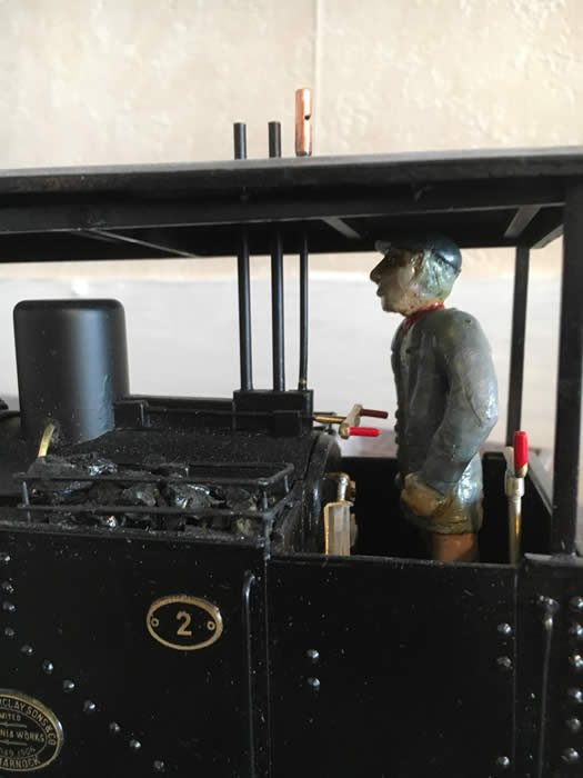 The smokebox door was shaped from laminated sheet. Some ladies might recognise the chimney, but very few men; it’s the spool from a Guttermans’ sewing thread spool and the dome was a problem until my wife produced a nice shaped bottle screw top. Lots of Cambrian rivets and a few bits of brass rod shaped for various fittings and Roberts your mothers brother.