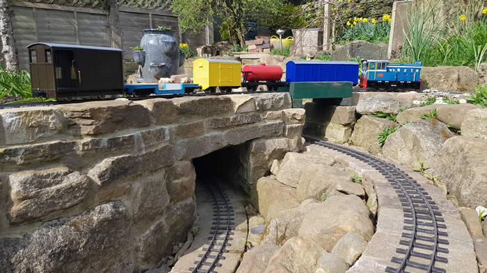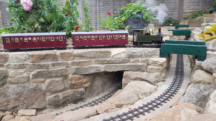 The main gradient is about 1:50, for about 25 metres sustained, climbing about 0.5m. One side slackens half of the gradient to about 1:80. The loop is continuous, so you can decide if you prefer to climb the slackened side, or the steeper side, and descend the other. The ruling radius is a couple of centimetres under 1.2m, which is about my worst parameter for visiting locos. Headroom is 210mm from rail head to the underside of the lowest bridge. So there will hopefully be few 16mm locos that it can't accommodate height wise. The main trackbed is 160mm wide, but there is a little more clearance than this on the bridges and tunnels. It should be sufficient enough to clear a RH VoR with a little margin.
