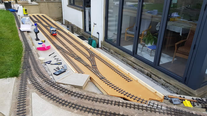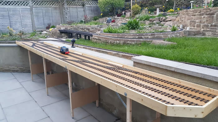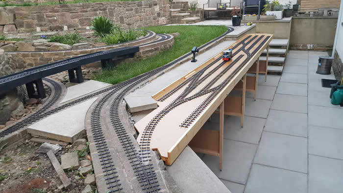 The total loop running length is around 68m. Four permanant sidings are planned; two shorter, which are in place, and two longer, which are not. There is also a removable steam up area at waist height, which should accommodate 7 sidings of varying lengths. Two of the longer and two of the shorter can also be combined into two very long sidings (~4m long) for those more exceptional trains. Bridges are as yet only wood, but there are plans to update these with something more in keeping.