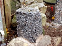 The viaduct is built on concrete piers these are cast in a steel split mould into which 6mm stainless steel studs inserted prior to casting. The concrete mix is 1 part cement, 2 parts sharp sand (the grittier to better), 1 part pea gravel and ½ part black cement dye. The mix is made fairly slack and poured into the mould and very well tamped down to ensure no air bubbles. After a day the mould is split and the pier is scrubbed with a stiff brush and water to remove the finings revealing the gravel, this produces a millstone grit look.