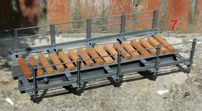 Completed span with handrails and timbers fitted (these are super glue in place prior to through drilling and bolting with 2mm stainless fasteners). The paint system is acid etch primer, black matt enamel and aged iron textured paint, this resembles the micaceous iron oxide paint used on ferrous bridges.