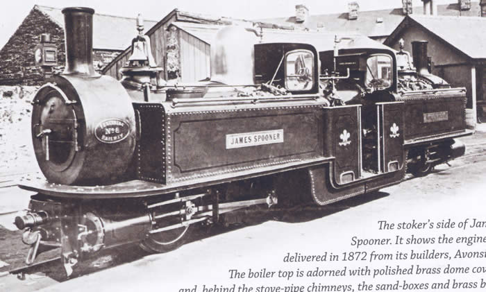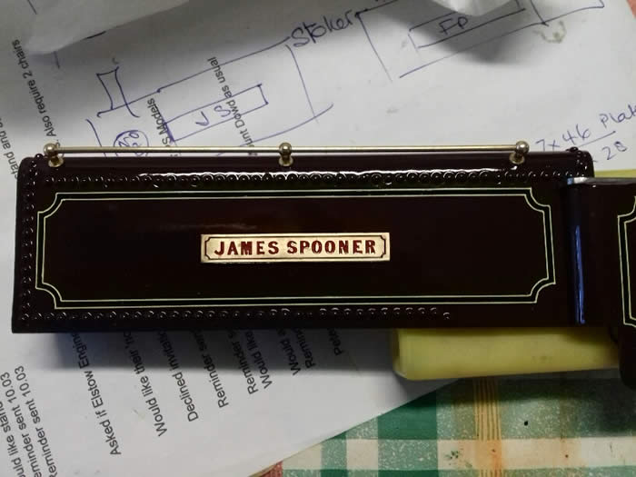 and reproduced on the engine [ Gerv Wright did the printing which says "James Spooner No8" ] I have added the controls for the driver: two regulator handles one for each bogie and one wheel to open both regulators at the same time. The wheel did not appear on the rebuilt locomotive ]