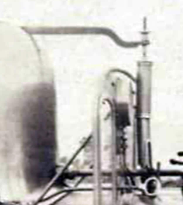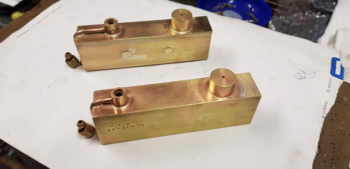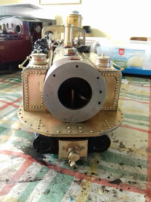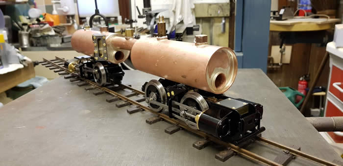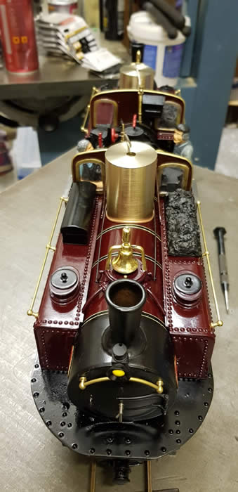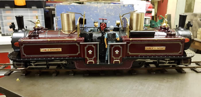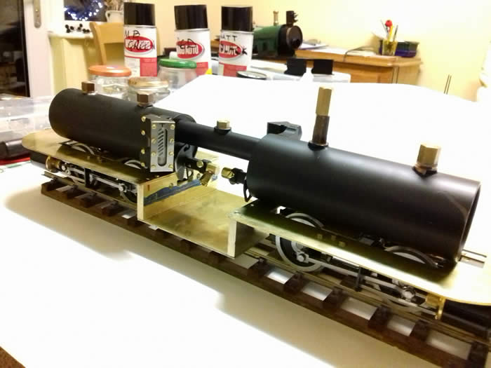 "James Spooner" has a gas tank, safety valve, water filler and gas burner for each boiler. It has one lubricator in a side tank and one regulator which is hidden behind the cab side sheet. The regulator servo, battery, gas tanks and large lubricator are in the side tanks so that the centre of the loco can be kept clear for scale details. There are two boilers joined by a single pipe from which there is one steam take off. [ See Making James Spooner's boiler in Projects ]. The boilers have main steam pipes so that each bogie has its own steam supply.