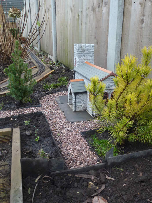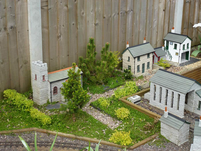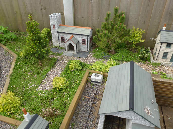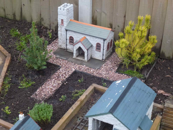 The pines are a Pinus mugo 'Orphir' (beautiful golden colour) and Picea glauca that looks a bit like a mini Yew which are common to churchyards . Both are dwarf with max height of 80cm. I have also put in some Lonicera nitida cuttings to make miniature hedges, a thyme plant and dotted around some Mind-Your-Own-Business which will hopefully spread to form 'grass' and keep the weeds away. The church, built from Jigstones by Bob Walker. is on some slates and the gravel paths are postcrete with gravel pushed in on top and slate edging. Just need to make some post and wire fences now down the railway to complete the effect.