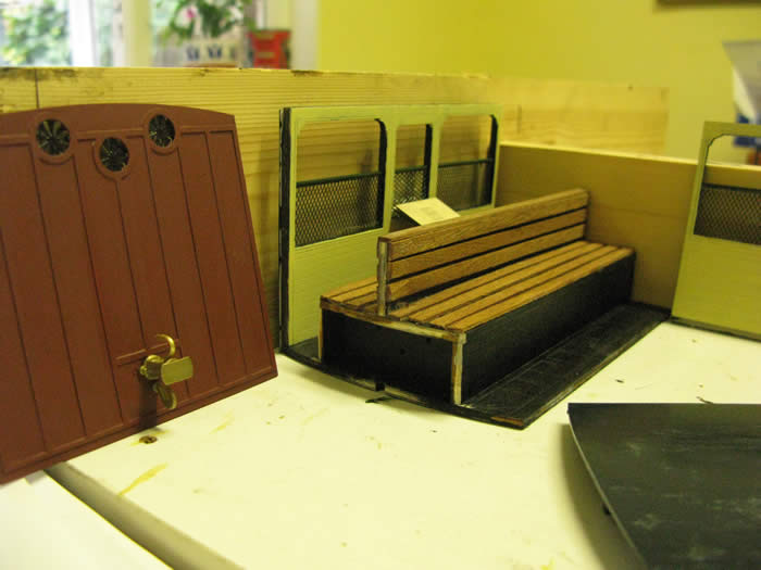 GWR cream for the insides of the coach and Slater's door handles and Ashbury couplings, with a hook made from 1/16 brass wire secured with a 10BA nut. The bench seat was given some boarding and matt varnished.