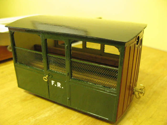 Brandbright wheels and bearings complete the model. Not that you can see them!! DJB transfers..maybe it will be FR 12 when rebuilt!! Give roof a coat of matt varnish and the ends and sides a coat of gloss varnish.