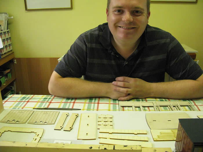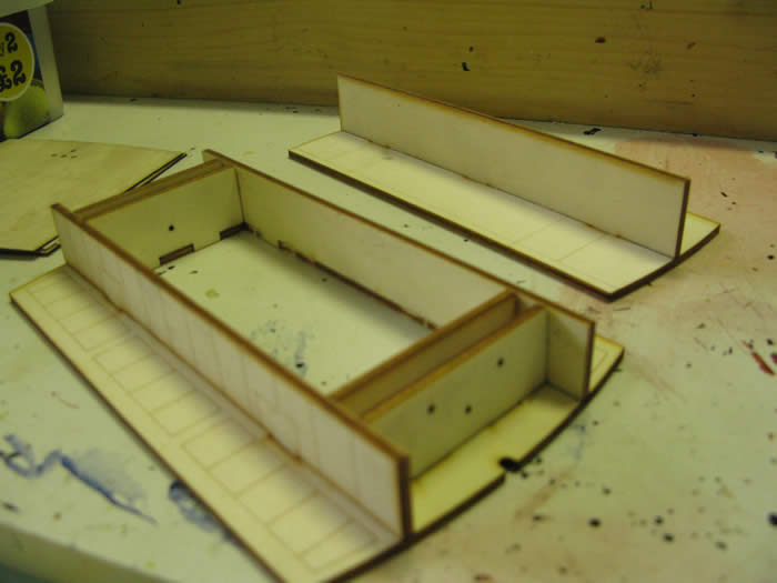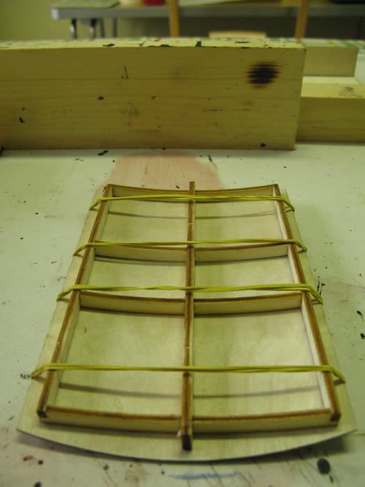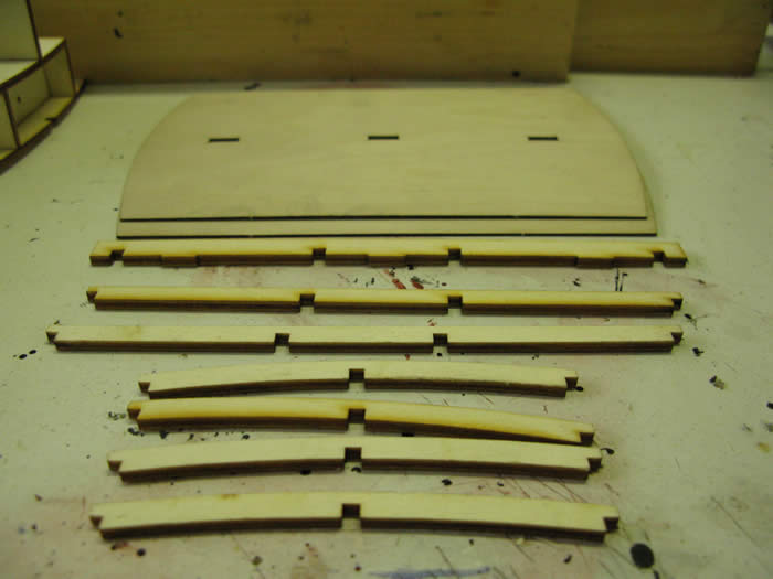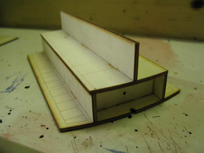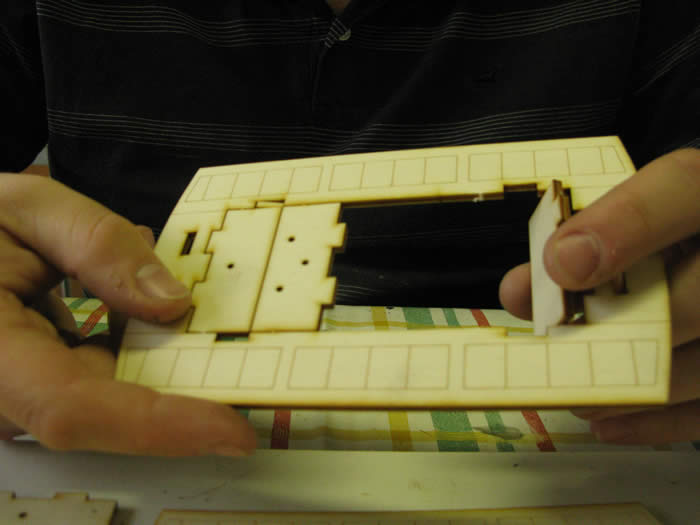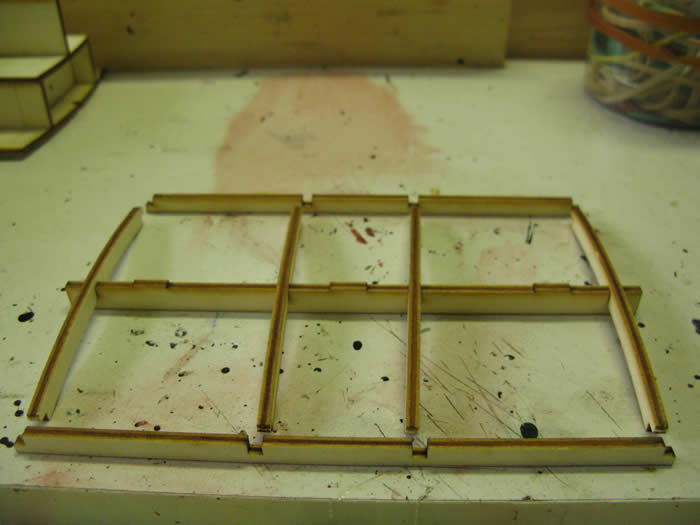 The roof frame is quite delicate. The roof has two layers. Fit the one with the location holes to the frame and let dry. Then glue on the top layer and clamp.