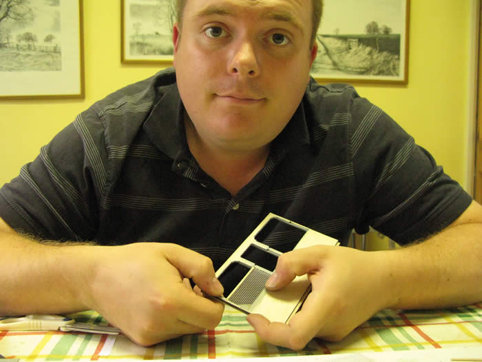 The mesh is attached and cut to size with scissors so that it fits in the recess. If you find that the mesh comes out of the groove secure with a tiny dab of superglue. The inside layer is then glued on top holding the mesh and the “rails” in place.