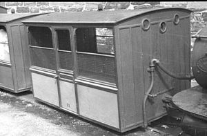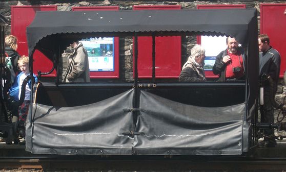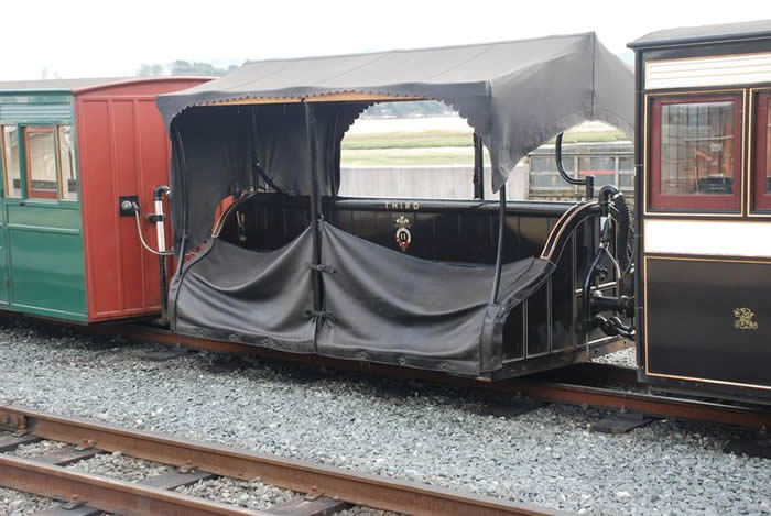 Originally fully open, the carriages were fitted with a canopy and aprons in 1871. There was a first class (with cushioned seats) and a third class (with plain wooden seats) version.