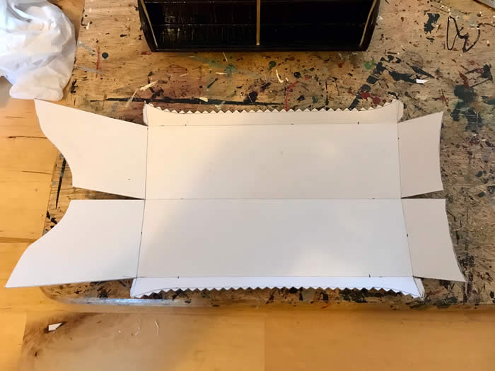 The plan was to cover the cardboard with a thin black cotton but when I tried it, it didn’t look as good as the black painted cardboard, so I just matt varnished the cardboard!