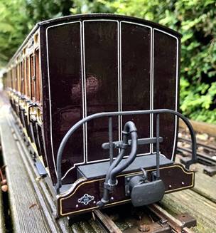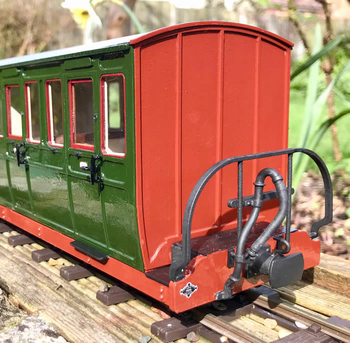 Once I’d hoovered out the interior (very important no bits floating inside!) the roof was glued on and secured with masking tape to dry, remembering to drill and glue in the bolts for the bogies before doing so. All the door furniture was then applied, door handles, buffers and lock cover plates (from Nicki SLR Models) along with decals (Endon Valley) to finish the model. The bogies and couplings were then added and the main body given a gloss