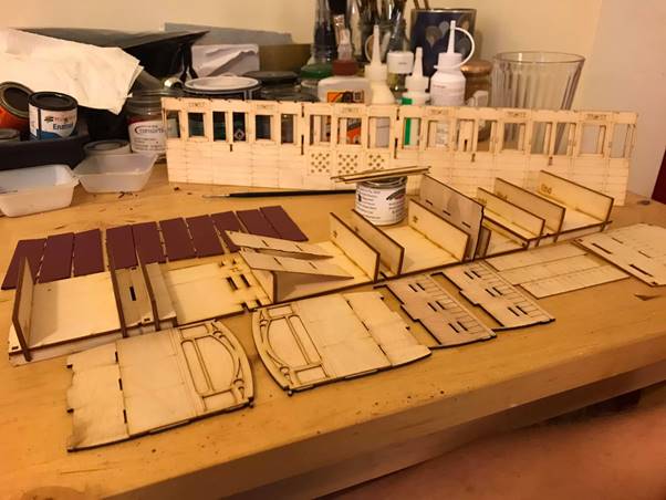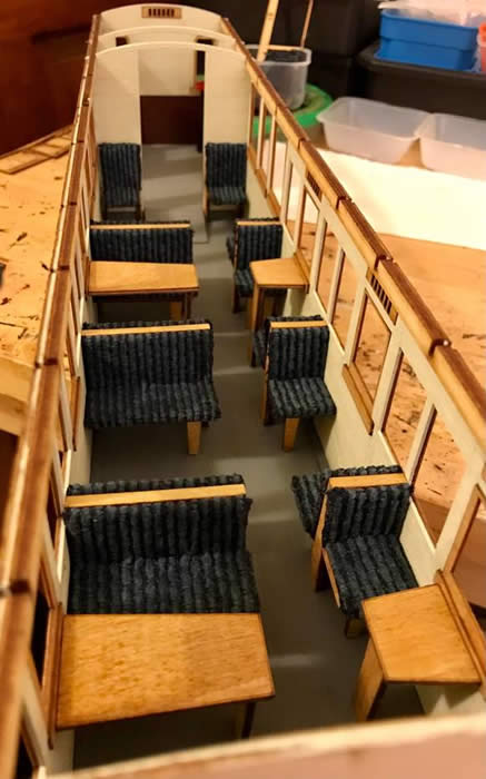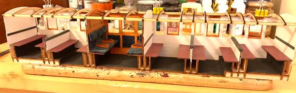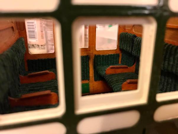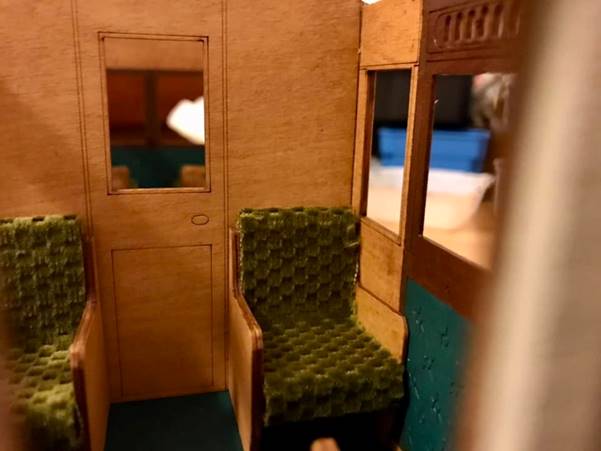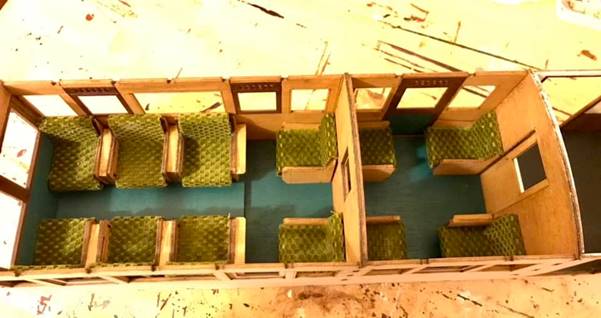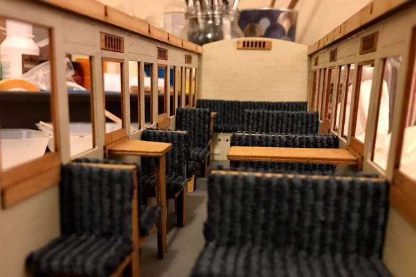 Now the interior can be completed to the level of detail you want, and here I decided to upholster seats and stain in the first class, and paint the third class cream as per the carriage as it is today, running in ‘1960’s’ guise, Garraway green and cream.The construction always uses layers to hide construction tabs and create strength. The interior sides are now pre- painted and then glued around the interior seating and partitions, along with the roof support beams, to create a strong unit around which the exterior is built. At this point the thin side layers easily take the tumbleholme shape of