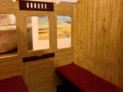 All construction was the same starting with the interior of the body. First class is stained to represent the oak panelling and third class is wood grained using scumble glaze, as per the prototype. First class is upholstered blue, and the third class has red cushions on the benches. Wood graining was a technique widely employed in order to give the illusion of a more expensive wood being used than was there in actuality. This is done by first painting the surface cream, followed by brushing on the scumble glaze and striking out with a stiff brush, or comb. I’m no expert, but with a bit of experimentation I achieved a passable finish including some wiggles to represent knots.