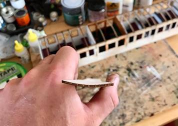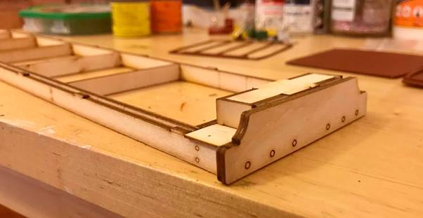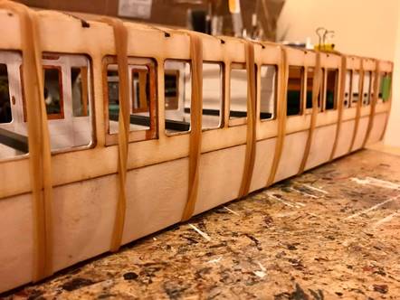 Now comes the middle layer of the body exterior in a thicker ply to create the depth of the sides of the carriage. This comes in two parts, an upper and a lower section. The upper section has cut outs for the windows, and the lower section has to be curved to create the lower tumbleholme side. At this point I decided to score, soak and pre bend the lower section to make it easier to build.