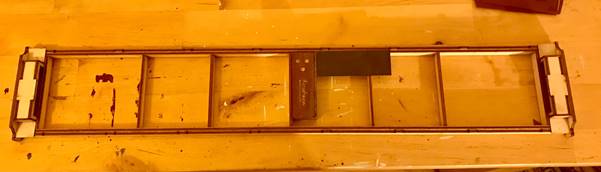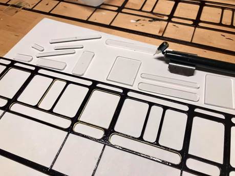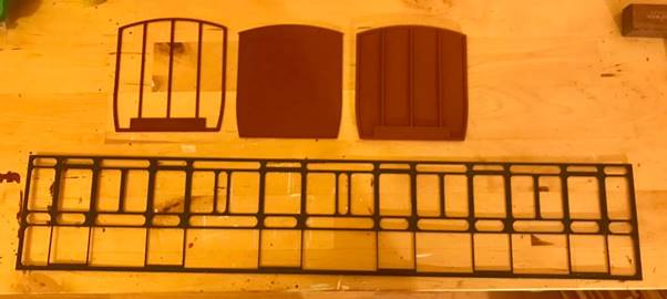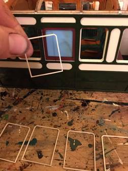 The next slightly daunting task was the glazing, window beading and droplights. These all have to be pre painted before application, and there are a lot of them! Droplights and window beading are Indian Red (Railmatch) and droplight beading is sprayed Arum white to match the sides.