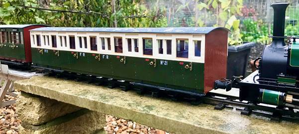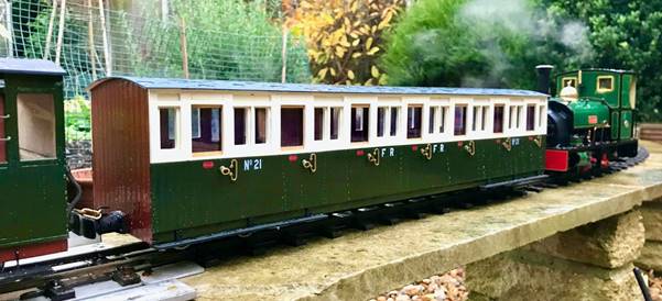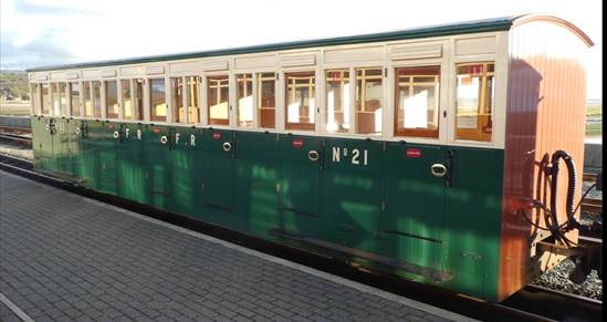 FR21 is a replica of the original that was scrapped in the early 1960’s. It was built between 2013 and 2019. The original carriage was built as part of a pair (with 22) in 1897 by the Ashbury Carriage and Iron Company as a ‘Tourist Carriage’. It carries what the FR refer to as ‘early preservation era’ livery that many of the carriages wore in the 1960’s. The originals would have had the cream top half but either a plum/purple or oxide brown lower half.