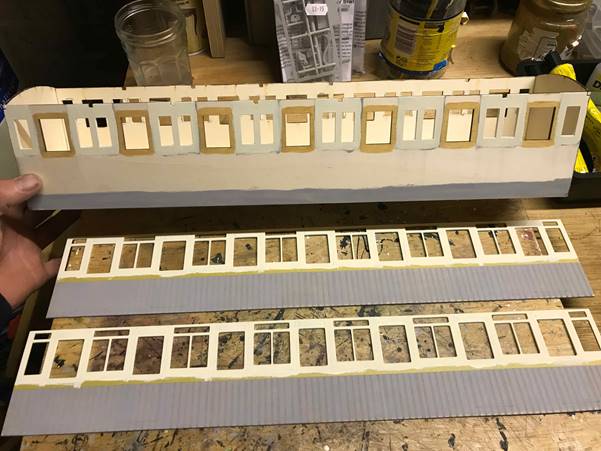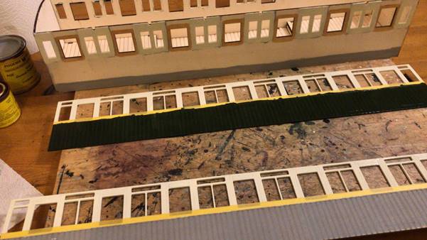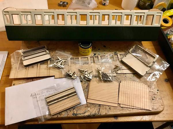 The kit starts by building the body structure. Seen here with the side overlays just propped up for effect. These were painted separately as was bits of the body structure to produce the droplight windows etc. the sides were primed, then masked in half and painted cream, then green in stages.