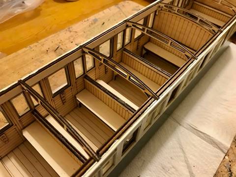Bogies were fitted and the the roof was added with my usual elastic band and wooden runners method. There is the option to make the roof removable but I didn’t attempt this as the roof framework in the kit is so flimsy.