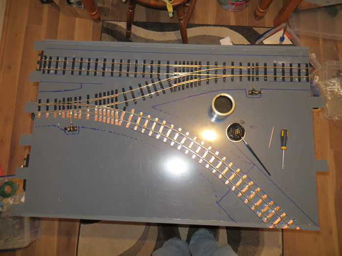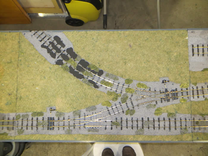 PHOTO 7 Work in progress on the new board for Saed-Y-Parc, with track laid and painting the sleepers under way. The two points (one of which is a stub point) were made separately. The plain track is laid in situ: thin 9mm-wide copper-covered fibreglass sleepers (Marcway Models) have been fixed to the PVC baseboard with superglue. The rail is code 200 bullhead (Marcway again) which is soldered to the sleepers, being careful to avoid heat build-up in the rail – if you allow the rail to get very hot, it causes the baseboard (which is just 5mm thick) to bend as the rail cools.