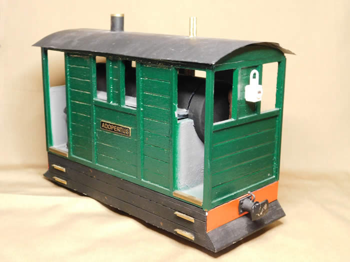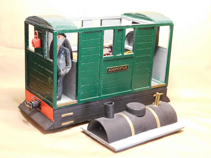 After painting, the tram locomotive was beautified with a little brass detail plus drivers and lamps at each end. A name plate was ordered from Narrow Planet as all steam locomotives, even battery powered tram locomotives, need a name. I opted for the pretentious Adopertus just so that people could ask what it meant. What does it mean? My school Latin dictionary tells me that it means clothed, covered, veiled or skirted.