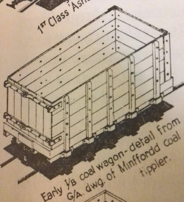 They had inside bearings and no centre buffers. They probably carried between 1 and 3 tons and were built as Boston Lodge 1862-64 [ Boyd pp339 The Festiniog Railway Vol 2 : 1975 ] There was at the time heavy traffic for coal, lime , manures, and general merchandise moving from Portmadoc to the inland towns.