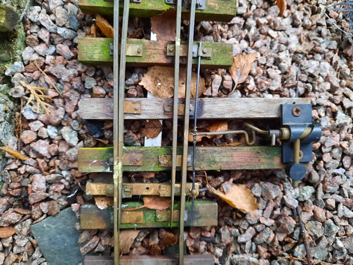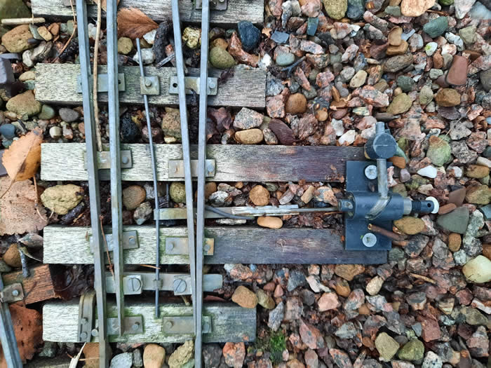 There is a fixed point at one end on a sleeper and the other end is attached to the tie bar between the point blades. For this connection, mine is a sliding fit using either a handrail knob or something similar I made. The middle of the spring is connected to the point switch.