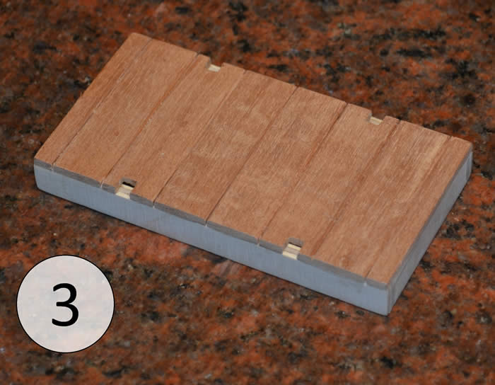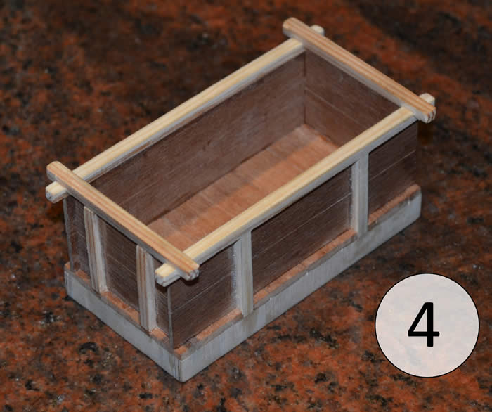 and these were cut from some unknown 1/16” hardwood I must have had for a least a decade. Similar wood but 3/64” thick was used for the sides and strapping made up from strip wood (photo 4).
