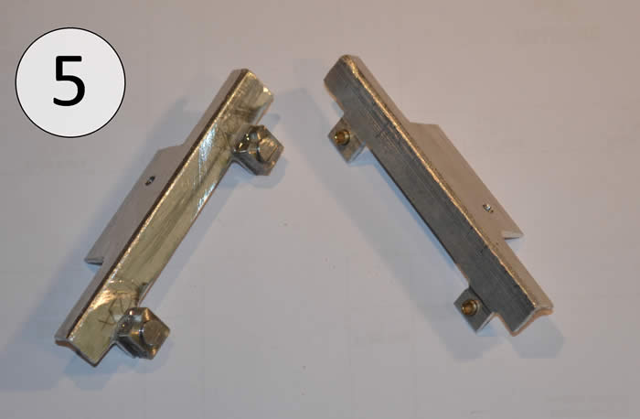 To hold the wheels (Slaters WD) I used some aluminium angle sawn and filed to shape and drilled to take the brass top hats. Dummy axle boxes were stuck onto the angle. These were turned and filed from a piece a square steel bar from an old door handle set. Photo 5 shows one side with these boxes in place the other with just the top hats.