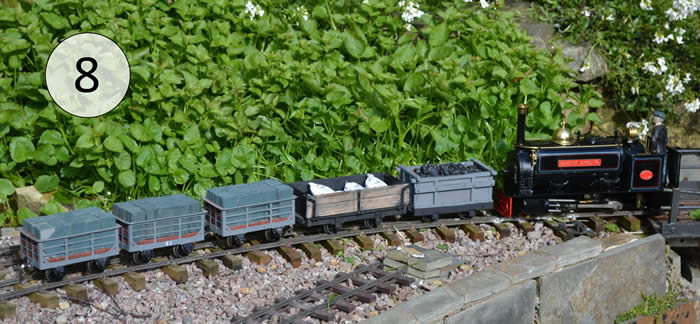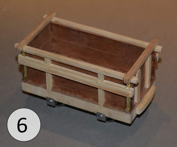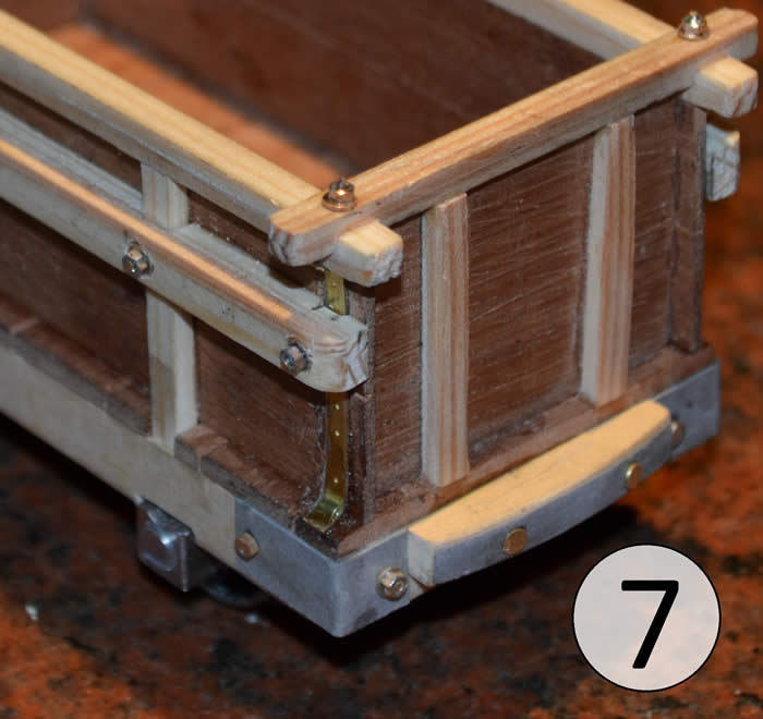The countersunk screw holes were made with a rivet embossing tool and the strip put on the wagon the ‘wrong way round’ so that the indentations showed.Photo 7 shows added detail.